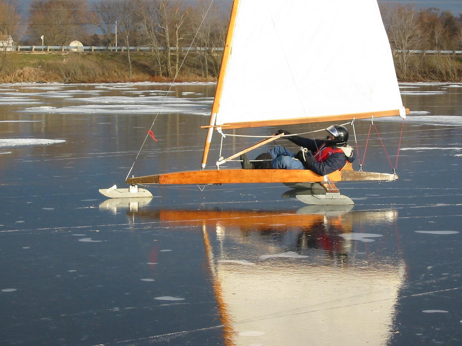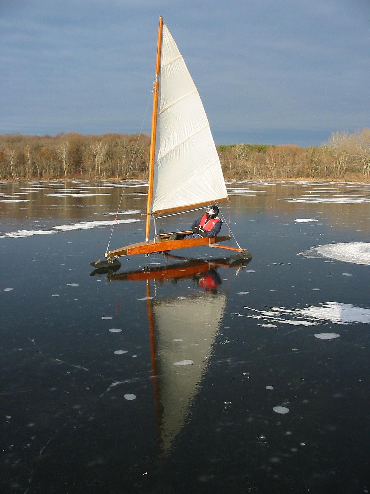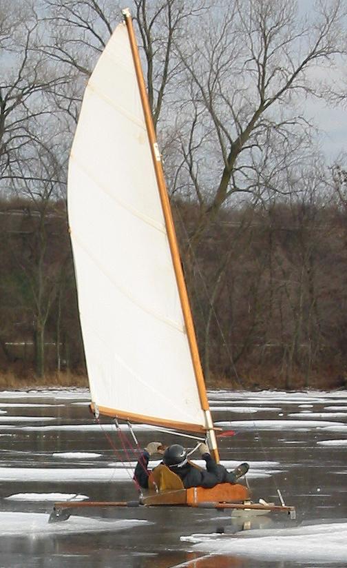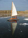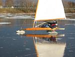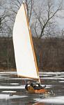 After checking Lake Wingra in Madison, and finding only 2 inches of ice, Dean Lima and I drove down to Milton and checked Grass Lake. Grass Lake is a small (70 acre), shallow (3 feet) lake. We found a pretty consistent 3 inches of black ice and decided to try some sailing. We had tried sailing on Grass Lake a couple of years ago, but the wind didn't cooperate then. For awhile today it looked like we would be 0:2, but the wind picked up and we got a number of pretty nice rides. I even spun the boat out once going down wind!