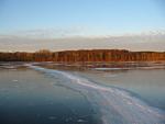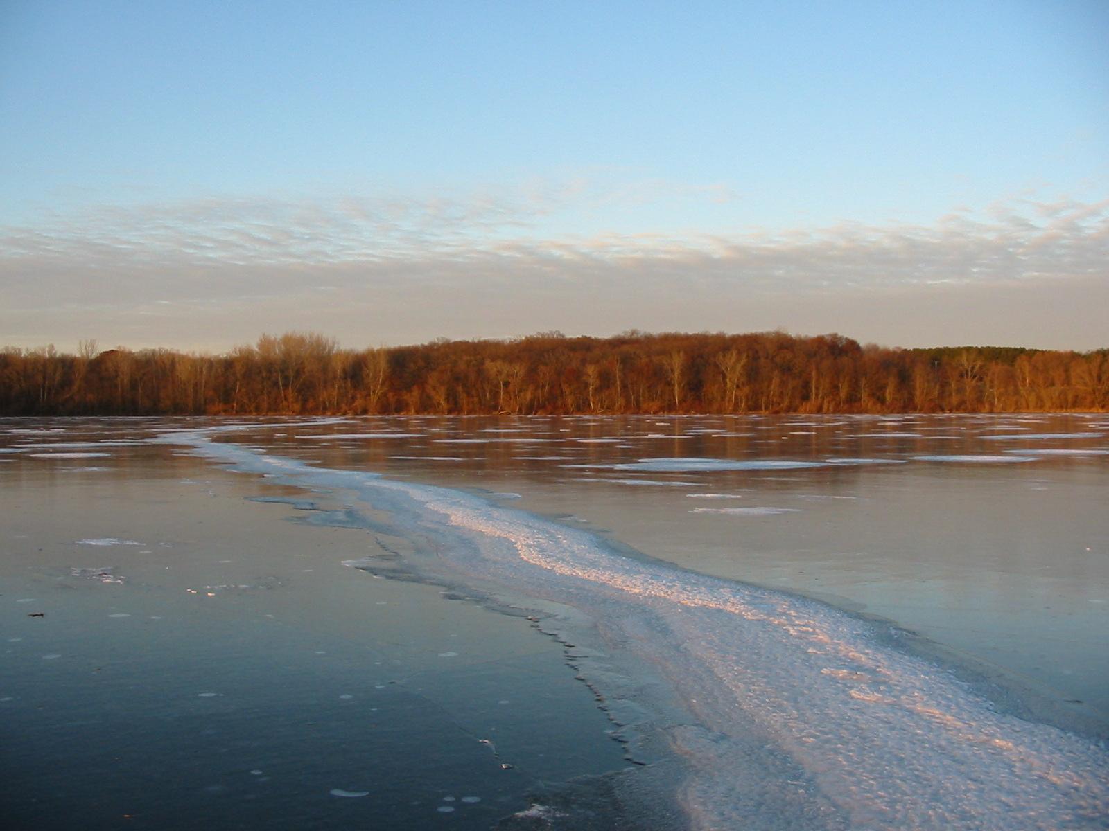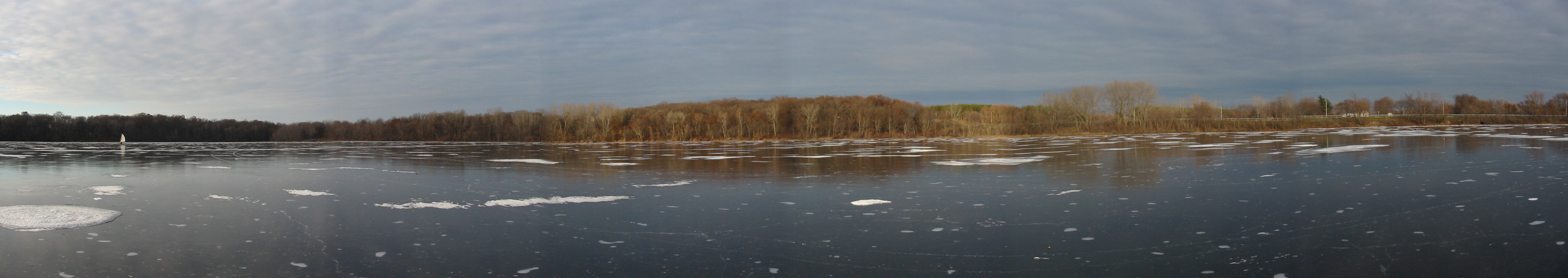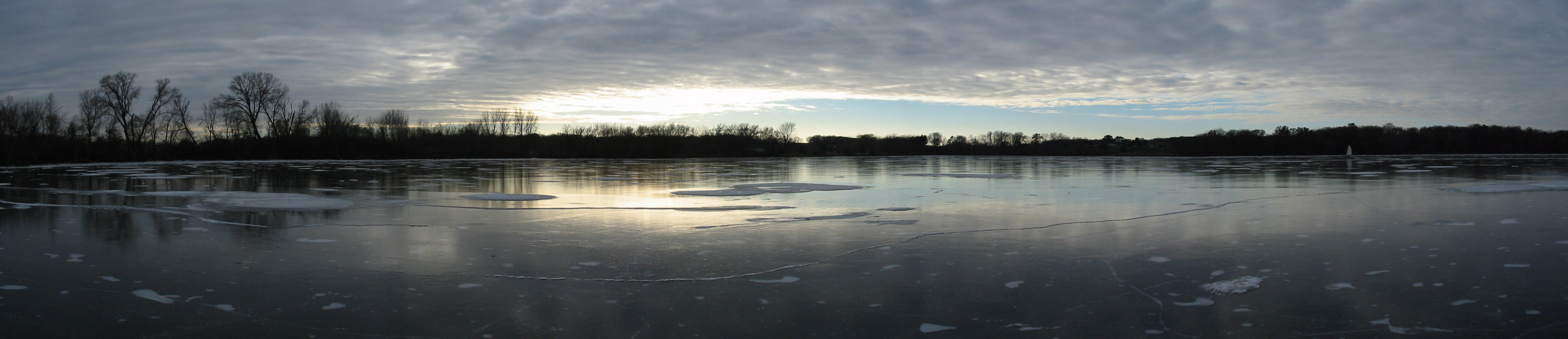 After checking Lake Wingra in Madison, and finding only 2 inches of ice, Dean Lima and I drove down to Milton and checked Grass Lake. Grass Lake is a small (70 acre), shallow (3 feet) lake. We found a pretty consistent 3 inches of black ice and decided to try some sailing. We had tried sailing on Grass Lake a couple of years ago, but the wind didn't cooperate then. For awhile today it looked like we would be 0:2, but the wind picked up and we got a number of pretty nice rides. I even spun the boat out once going down wind!