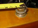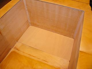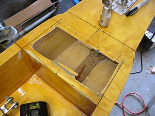 Once the old bulkhead was completely removed, the deck was carefully marked and cut at the exact postion of the new bulkhead with a saber saw and a high-quality wood blade. The newly exposed sides were sanded to remove bumps and imperfections in the epoxy surface that was previously hidden behind the bulkhead. The piece of 3/8" Occume plywood reenforcing the deck was carefully cut back the thickness of the new bulkhead using a hand-held Dremel® tool with a small (ca. 1/8" dia) straight bit. A piece of Sitka was cut to about 1/8" larger than the inside dimensions of the new bulkhead position. The new bulkhead was carefully shaped to the opening by test fitting and adjusting all four sides with a stationary belt-sander. To facilitate the final fitting, a drywall screw was screwed into the center of the bulkhead and used as a handle. The Occume plywood reenforcing the bottom skin was left in place and a notch cut in the new bulkhead.